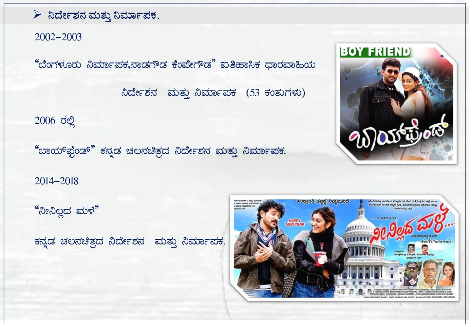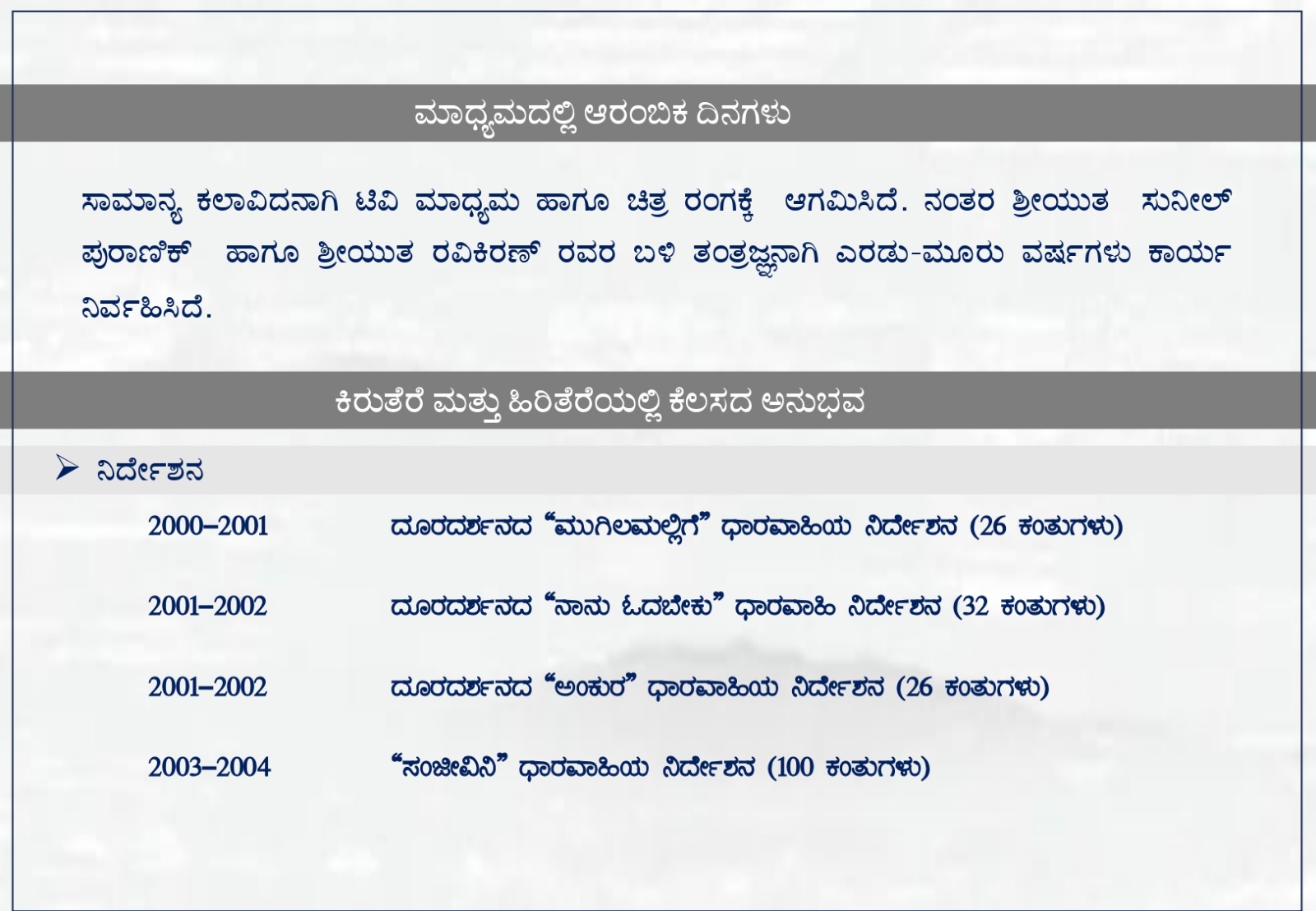 - Directed acclaimed television serials such as "Mugila Mallige" and "Ankura."